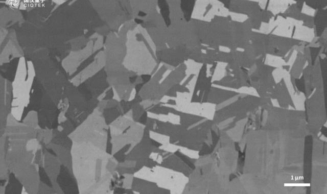 When the sample surface is sufficiently flat, electron channel contrast imaging (ECCI) can be obtained using the SEM backscatter detector. The electron channeling effect refers to a significant reduction in the reflection of electrons from crystal lattice points when the incident electron beam satisfies the Bragg diffraction condition, allowing many electrons to penetrate the lattice and exhibit a "channeling" effect. Therefore, for polished flat polycrystalline materials, the intensity of backscatter electrons depends on the relative orientation between the incident electron beam and the crystal planes. Grains with larger misorientation will yield stronger backscattered electron signals and higher contrast, enabling the qualitative determination of grain orientation distribution through ECCI.
